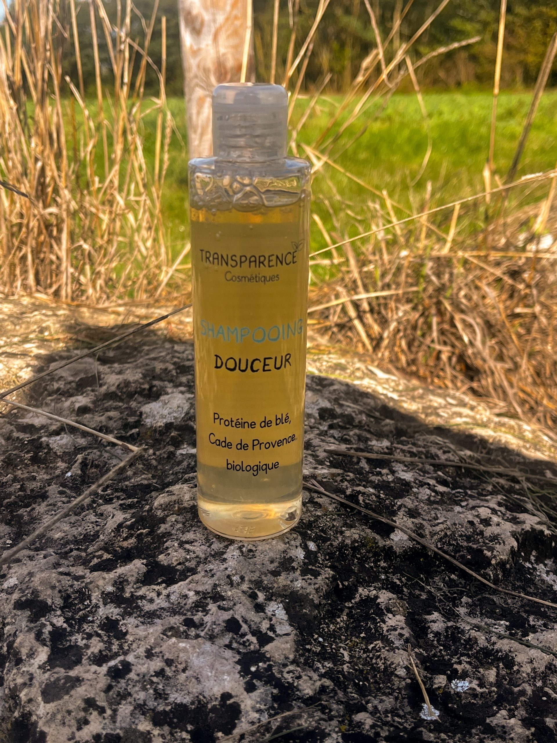 Eau de source (Montcalm), jus d’aloe vera biologique, base lavante issue du coco, hydrolat de Cade biologique, base lavante issue du sucre, protéines de pois (actif 100% végétal), gélifiant naturel composé de sucres naturels, émollient d’origine naturelle (assouplit le cuir chevelu), extrait de radis fermenté, parfum 100% d’origine naturelle, acide citrique, sel, conservateurs (nature like agréés en cosmétique bio), allergènes (contenus dans le parfum naturel).