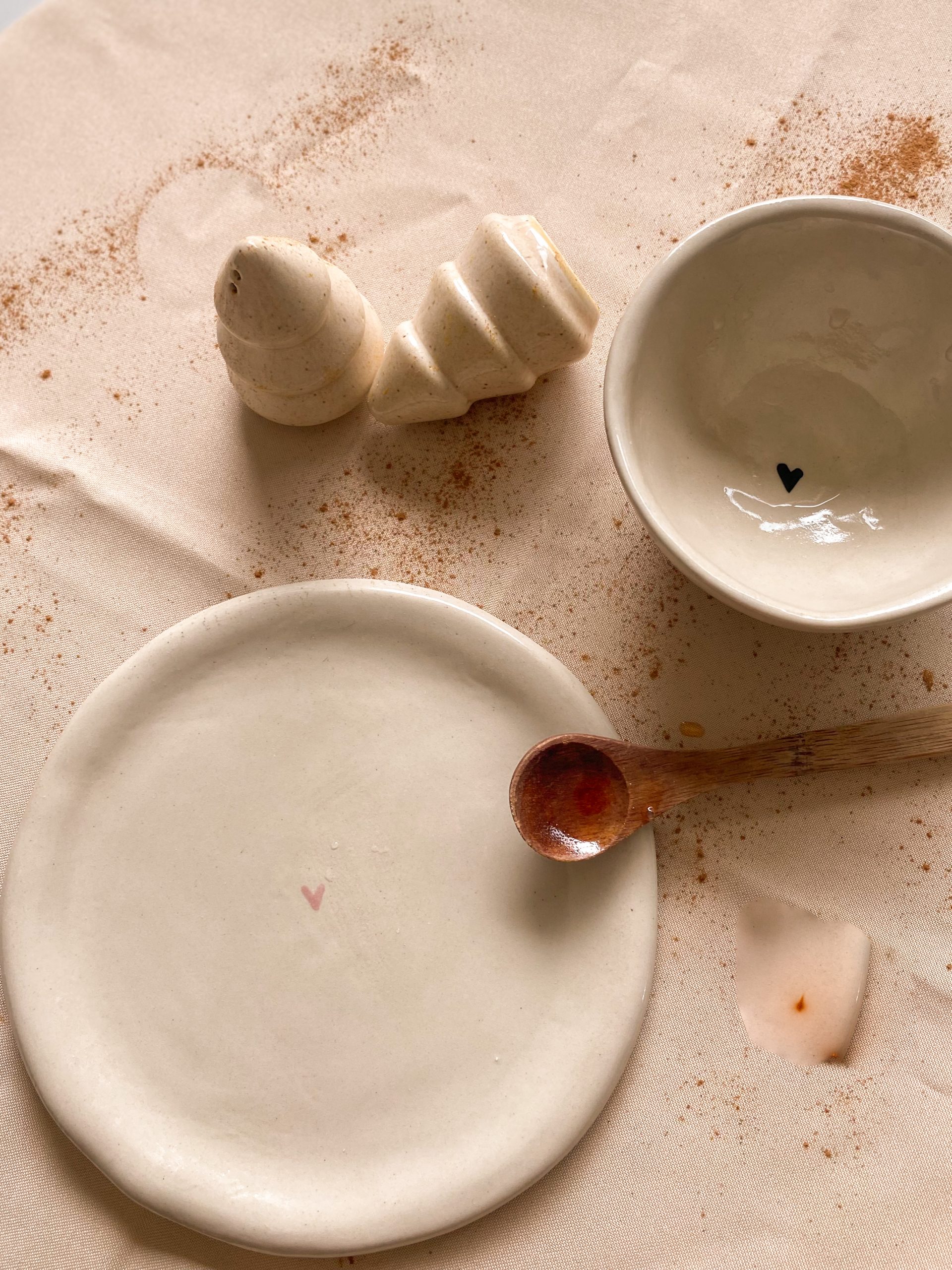 – 1 assiette à dessert (couleur du coeur disponible en jaune orangé, beige, noir ou rose)
